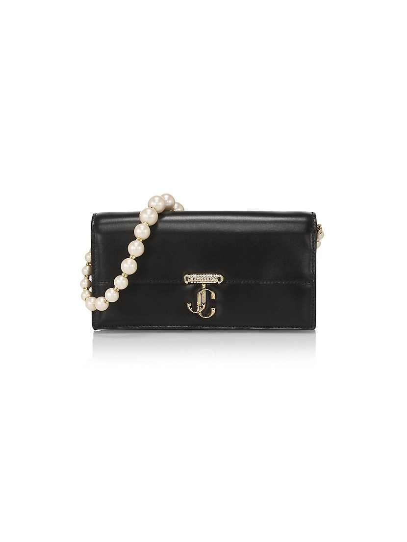 Jimmy Choo's Varenne wallet flaunts a removable faux pearl strap and rhinestone-embellished logo hardware.
