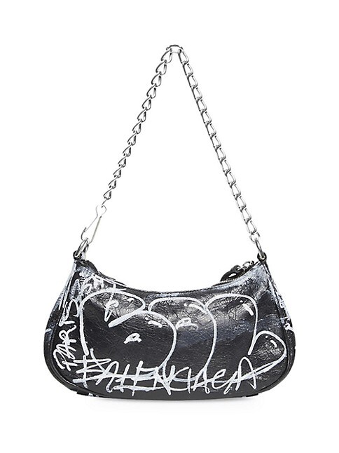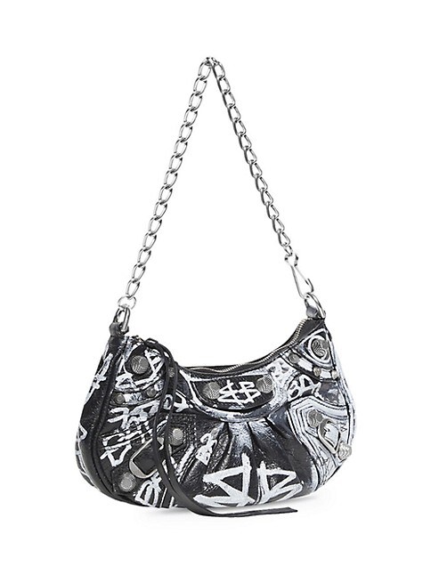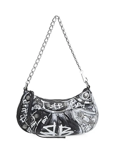 Le Cagole mini bag with chain in black and white Graffiti printed Arena lambskin, aged-silver hardware.