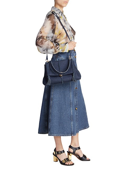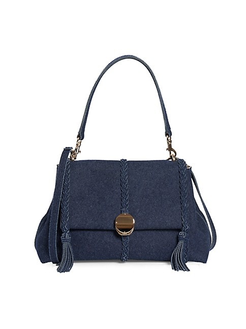 Chloé's Penelope shoulder bag features a rounded flap-front silhouette crafted of denim. Braided trim, modular straps, and a lock inspired by the brand's jewelry archive define this versatile style.