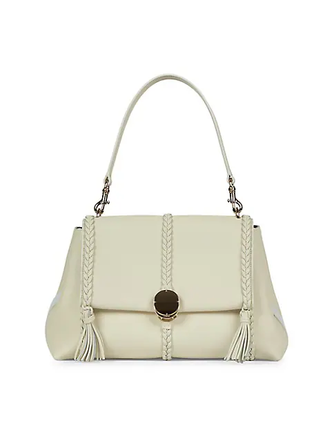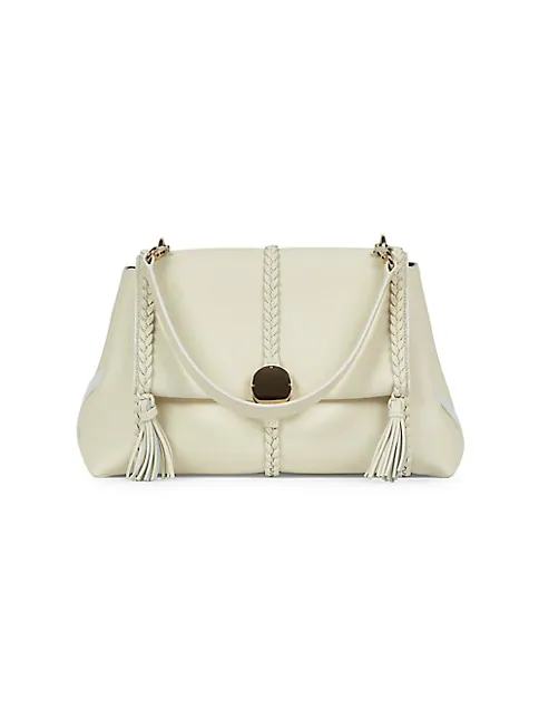 Chloé's medium Penelope shoulder bag features a rounded flap-front silhouette crafted of leather. Braided trim, modular straps, and a lock inspired by the brand's jewelry archive define this versatile style.