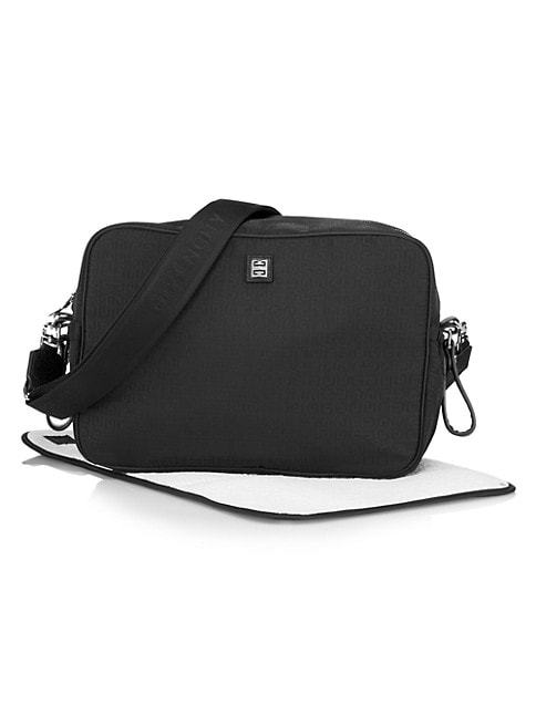 A coated changing bag is detailed with 4 G jacquard all over, leather details, strap with Givenchy logos band, 4 G metal plate with a terry changing pad, and pocket.