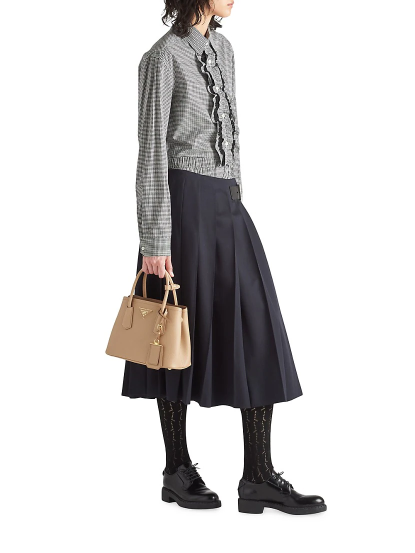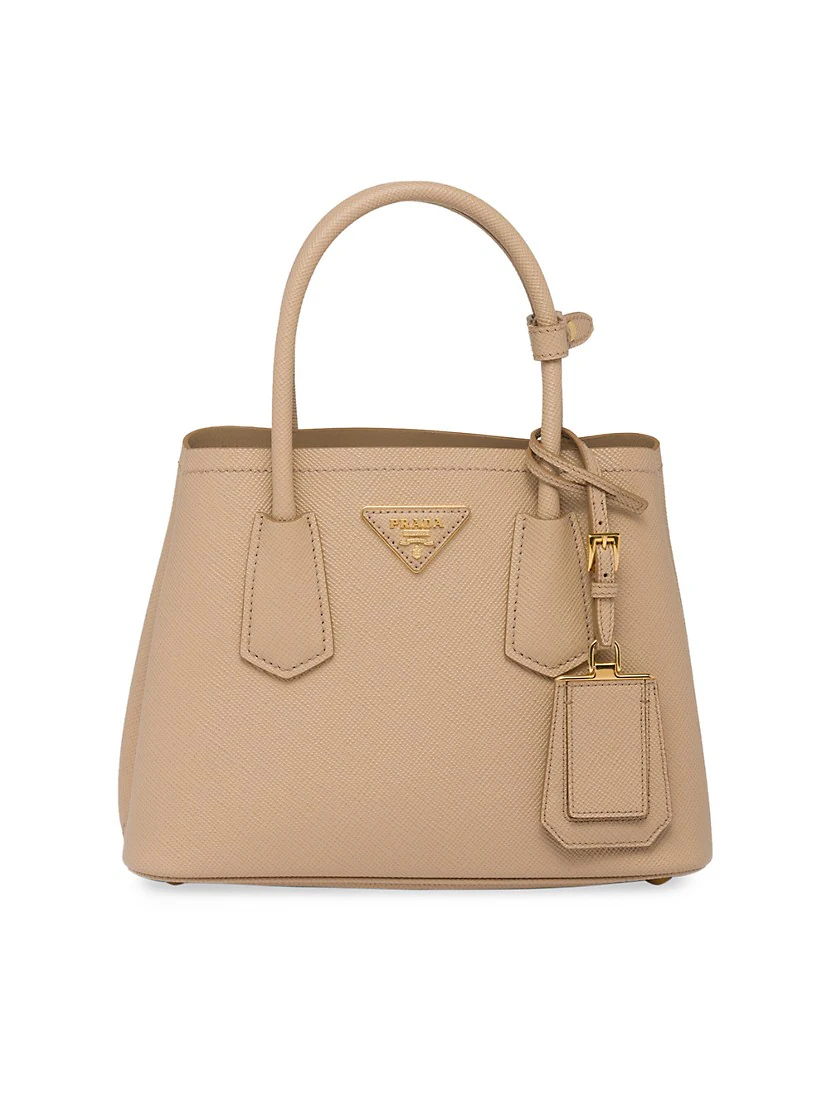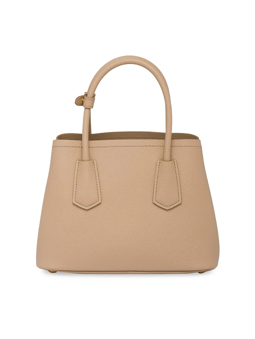 Refined, delicate details give new life to iconic designs of the brand like the Prada Double bag with a new mini design that is versatile and sophisticated. A tonal leather triangle frames the iconic metal lettering logo that decorates the front, while the detachable shoulder strap lets the bag be worn slung over the shoulder or as a crossbody bag.