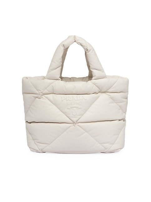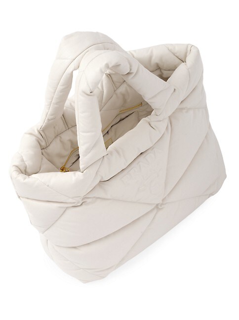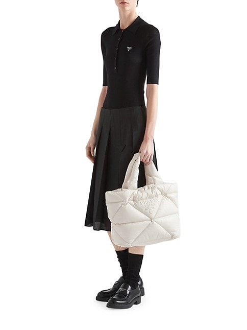 Reinterpreted in always new ways, Prada's iconic triangle is repeated in the quilted motif of this soft padded nappa leather tote bag to create a patchwork motif. Sophisticated allure and precious details: the lettering logo is embossed on the front, while the nappa leather lining has two pockets.
