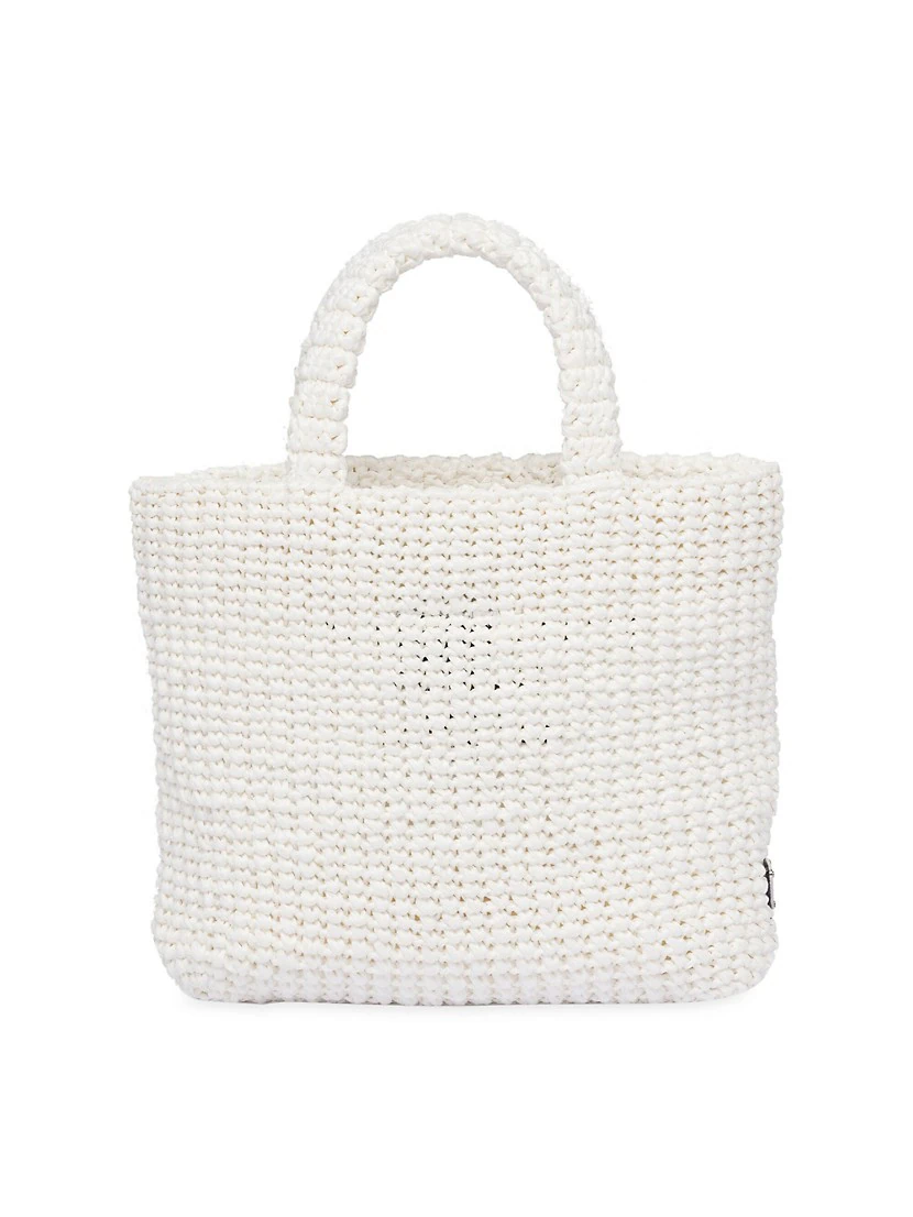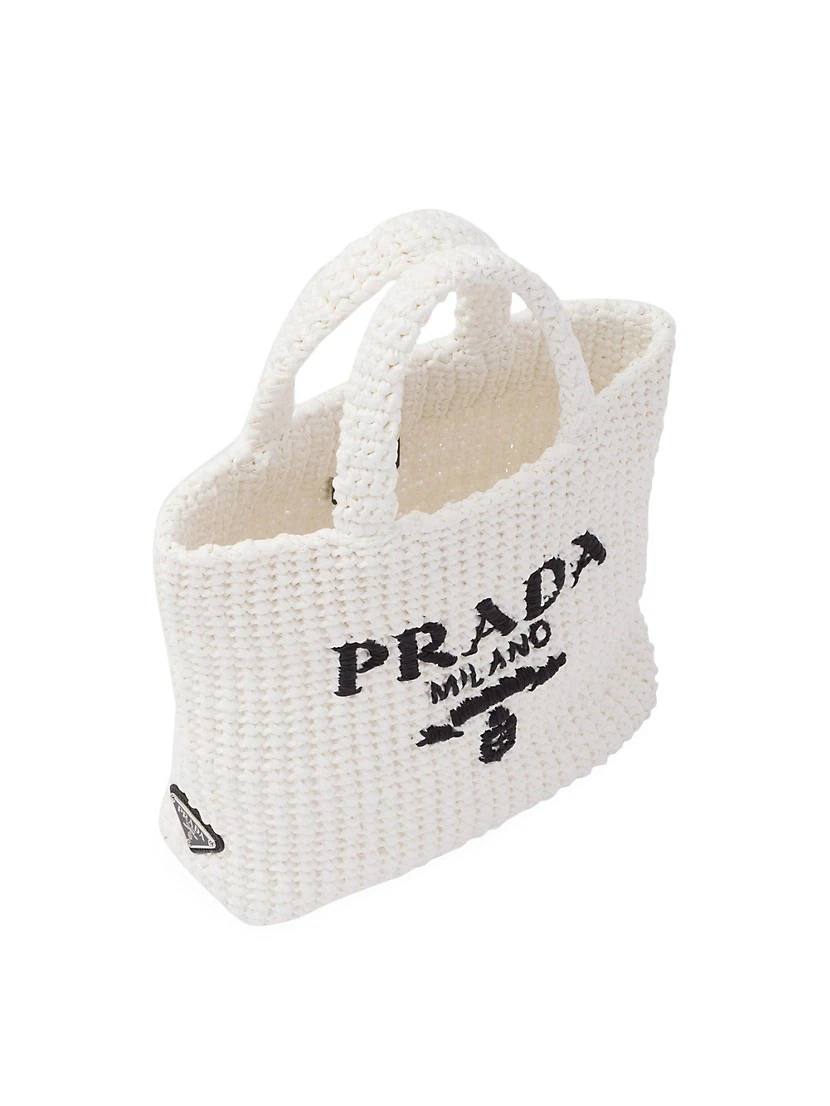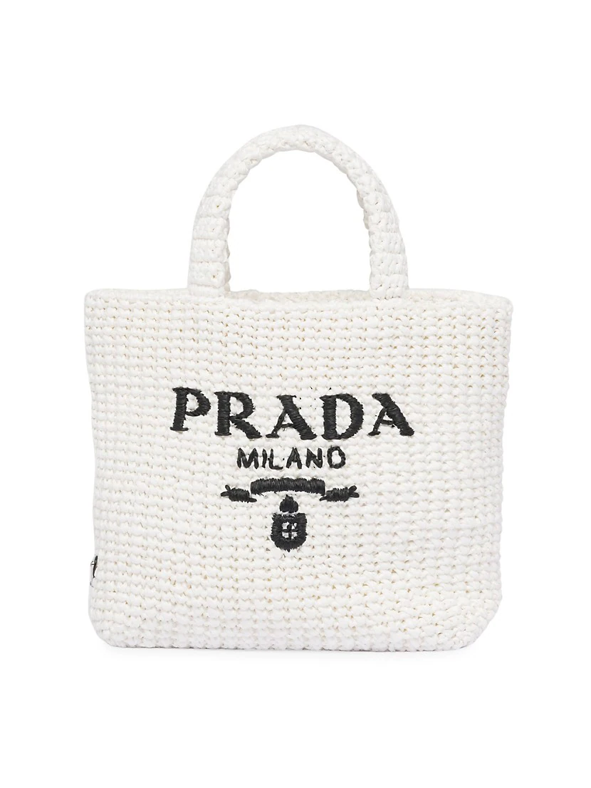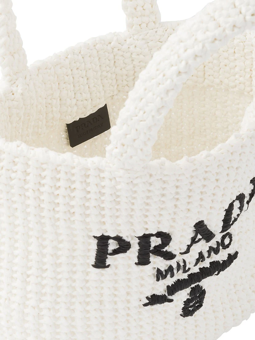 This tote bag with a soft, deconstructed design is made of raffia, a light material of natural origin with a summery mood. The embroidered lettering logo adorns the front, while the emblematic enameled metal triangle logo decorates the side.