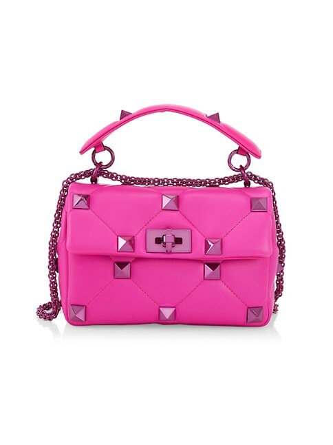 Pierced with signature spiked studs, Valentino Garavani's shoulder bag is crafted of rich lambskin leather with diamond-quilted overstitching.