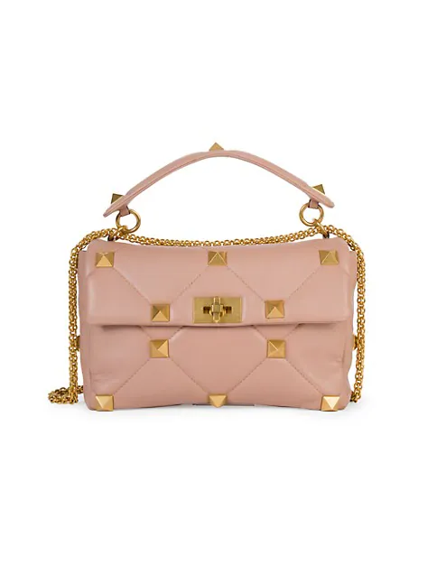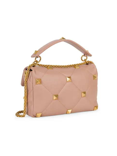 Crafted of supple leather, this slouchy shoulder bag is dotted with polished studs and features a diamond-quilted motif.