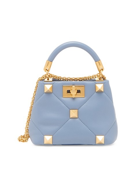 From the Roman Stud Collection. Bold rockstuds lend a Roman neoclassicism aesthetic to this trapezoidal top handle bag.