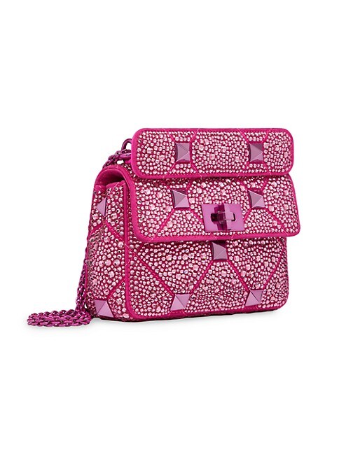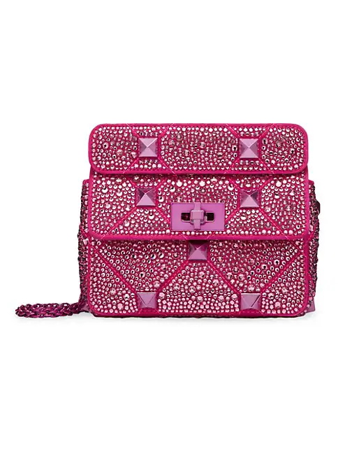 Small Valentino Garavani Roman Stud The Shoulder Bag with allover rhinestones and toneontone maxi studs. Equipped with both a detachable sliding chain strap and a detachable handle, this accessory can be worn as a crossbody/shoulder bag or used as a handbag.